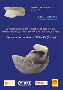 Samedi 14 février 2026, à 14h15, à l’UPVD amphi Y, conférence de Manon Géraud (Inrap) : La “Commingeoise” : succès et disparition d’une céramique non-tournée au bas Moyen Âge